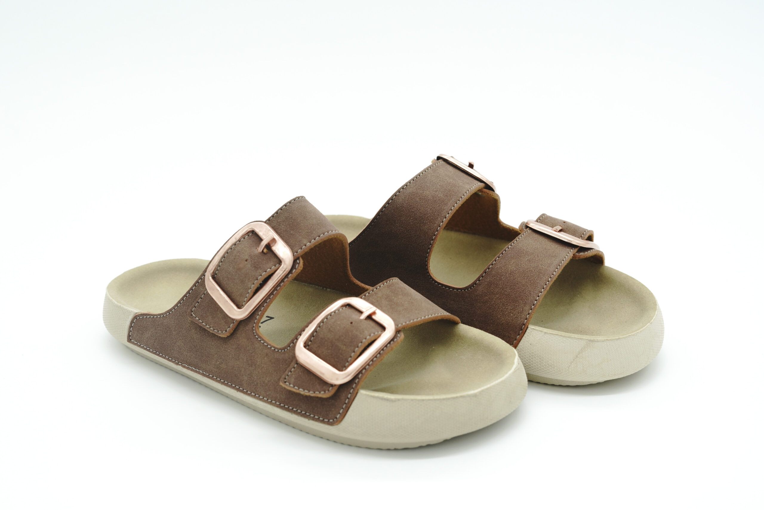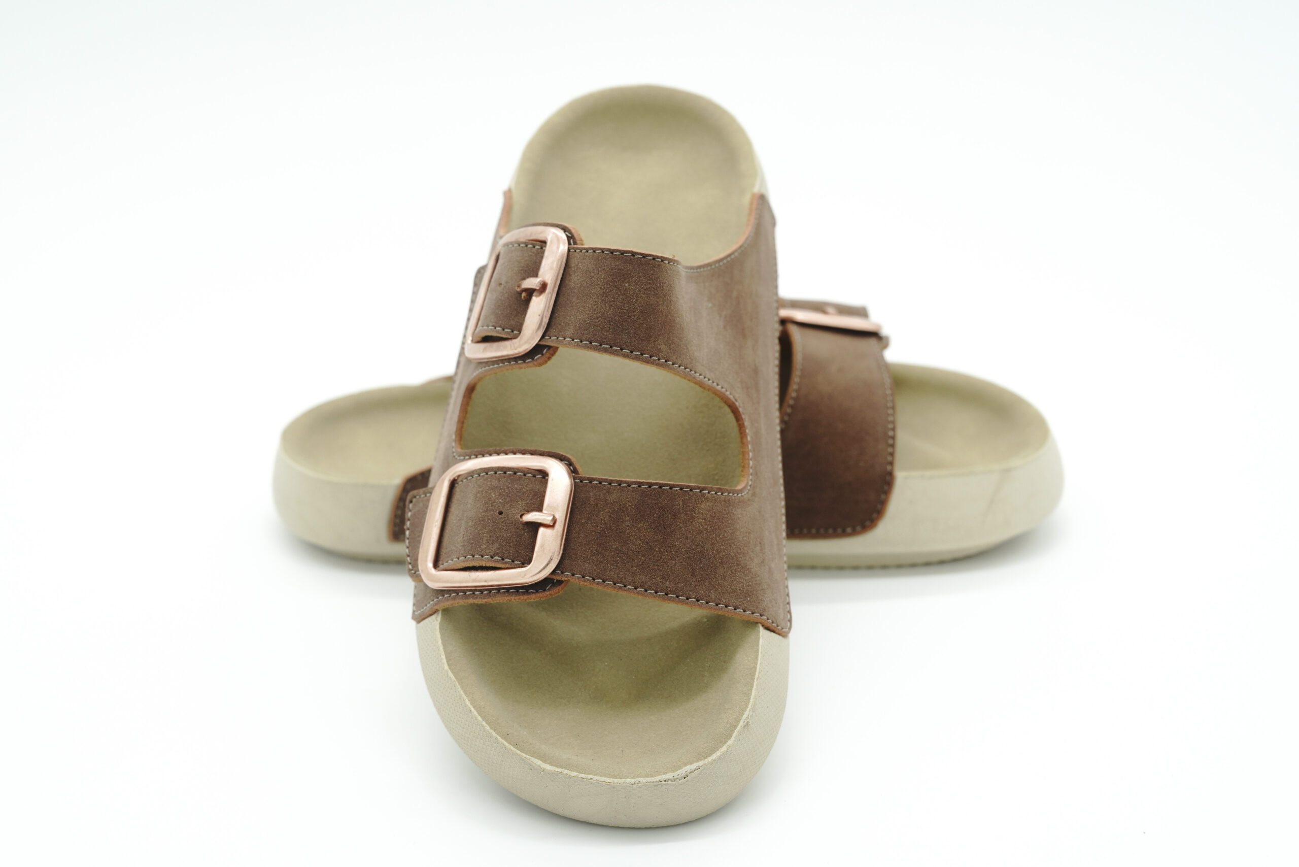 Taba rengi, çift tokalı Luvesta terlik, ortopedik tabanı ile günlük kullanımda konforlu ve şık bir tercihtir.